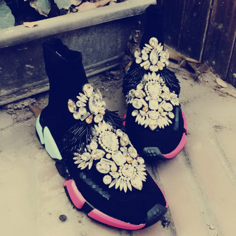 2019 Crystals Sock Sneakers Boots Sport Female Flat Polyester Spandex Ankle Length Rhinestones Sock
